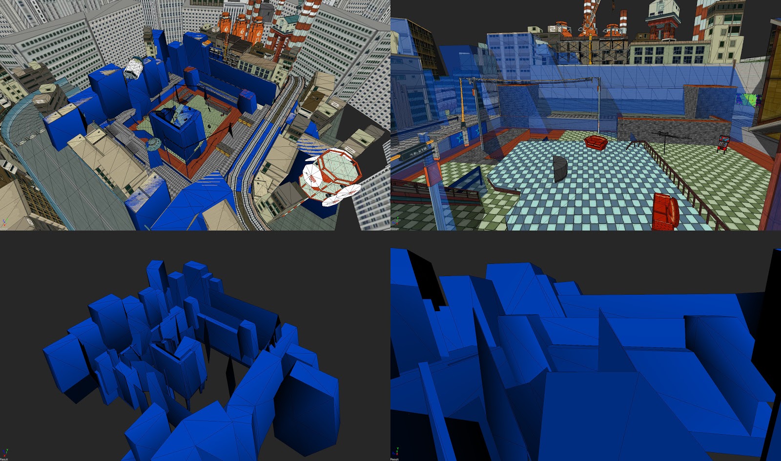 A JSRF level is mainly composed of 3D models, of two kinds, one for the visuals that we see and uses textures (top left picture), and another, invisible in-game which is used for the physics simulation(top right pic) and how the player controller interacts with the environment's surfaces.